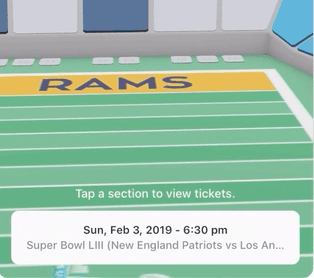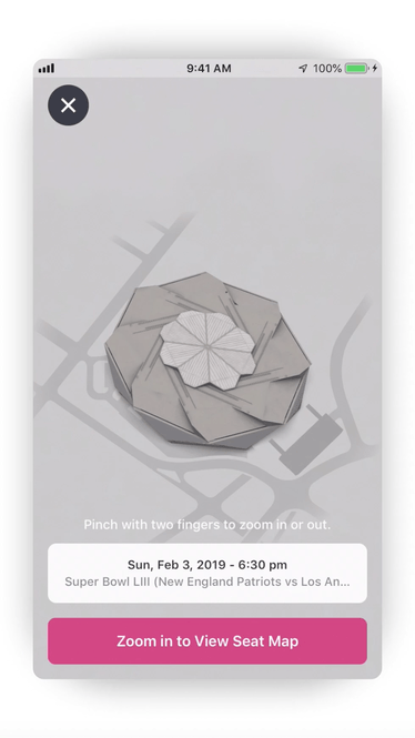 Before I joined the team at Prolific they had previously launched a similar feature using a 3D map in Augmented Reality for Super Bowl LII in 2018. The goal of the feature was similar to the ticket buying experience I was asked to build with one key difference: users were not able to complete the purchase of their tickets using the AR experience. This was mostly due to technical limitations and the constraints of the design choices made at the time. Because of that disconnect, the feature usage was moderately successful but those challenges would directly inform our strategy for 2019.
