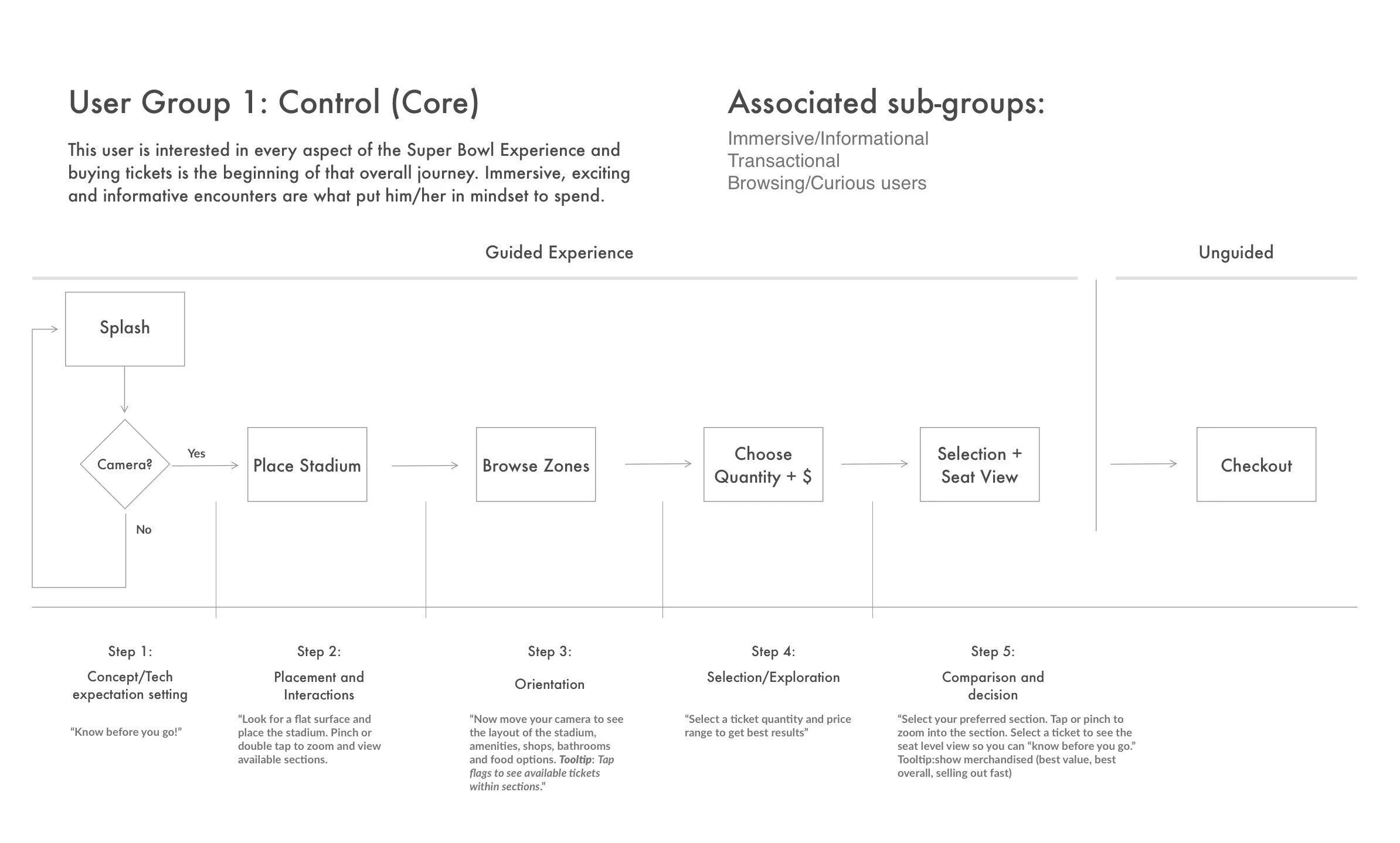 This feature was built to augment the existing checkout flows. The diagram below designates the build as “Guided Experience” which includes the rendering of the 3D map in real space, Browsing merchandised zones (“Best Value”, “Highest Price”, “Best View” etc.), Selection and 1st person views of the seats. This flow helped give users a unique view of their tickets which gave additional comfort/assurance given the high ticket price of this event. As a rallying cry, we used the design slogan “Know Before You Go” to keep us focused on the central principle of this feature.