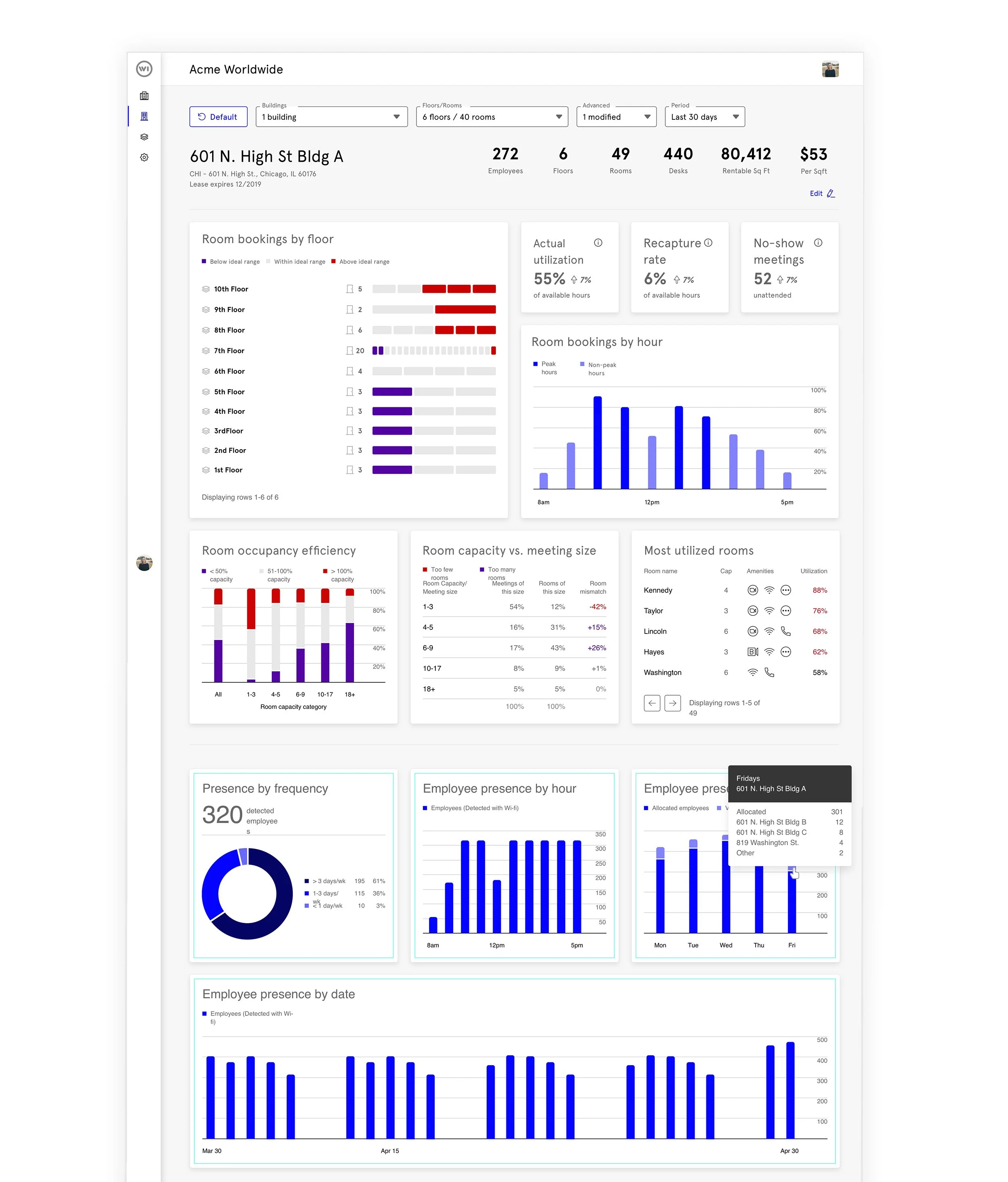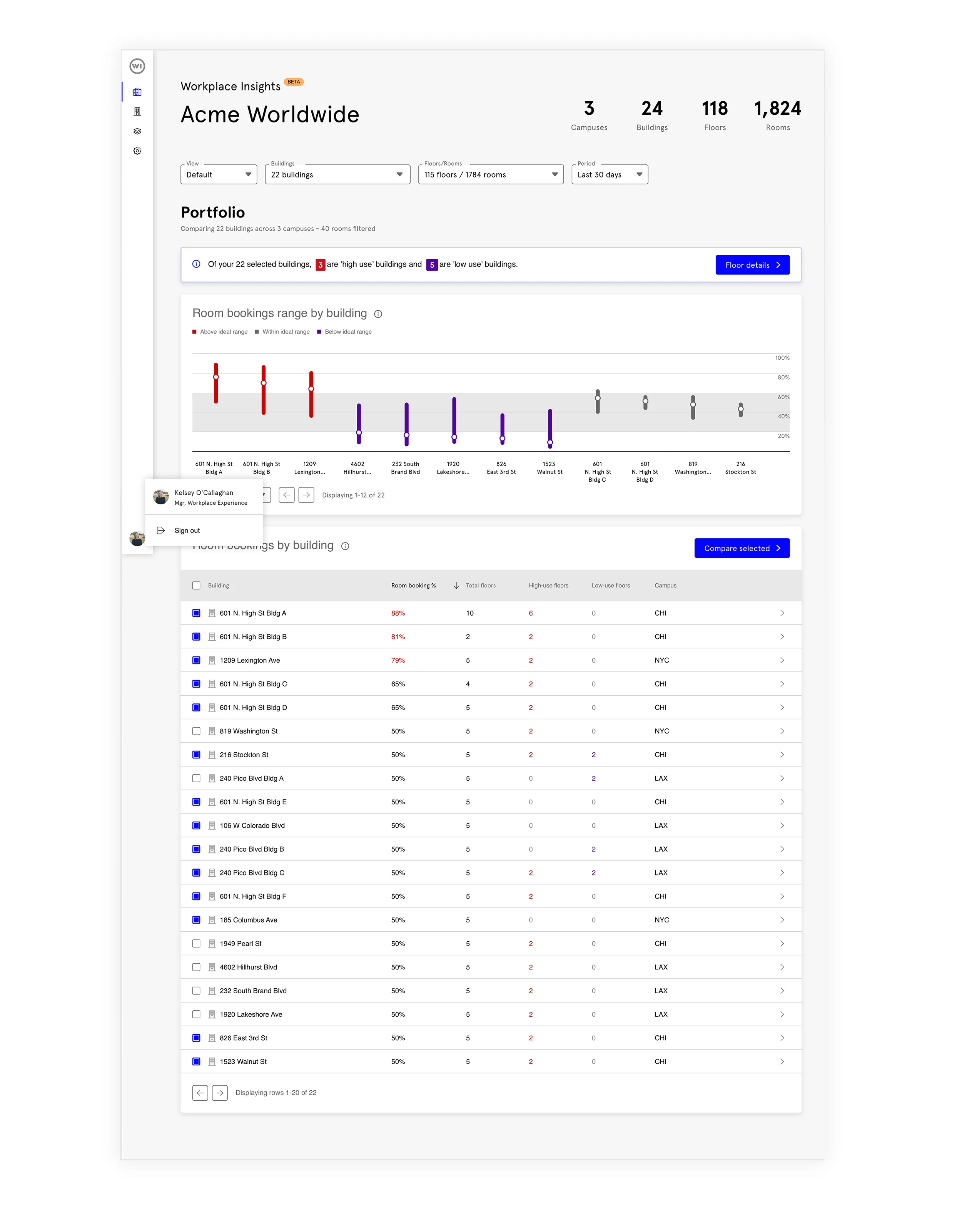 Design and build a Beta version dashboard that can help Real Estate Planning Admins to gain insight about how their real estate portfolio is being utilized and give them actions to optimize + balance usage.